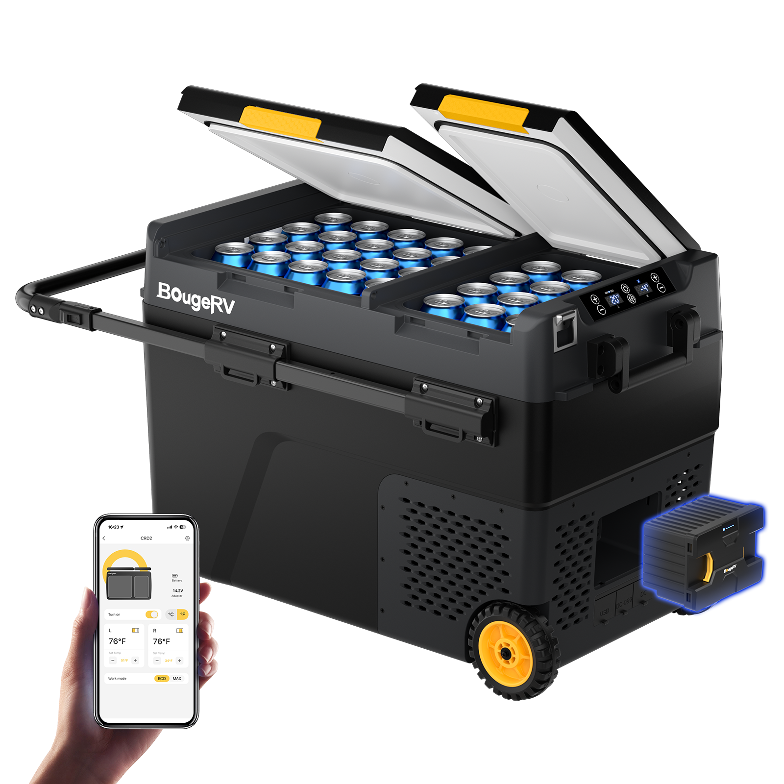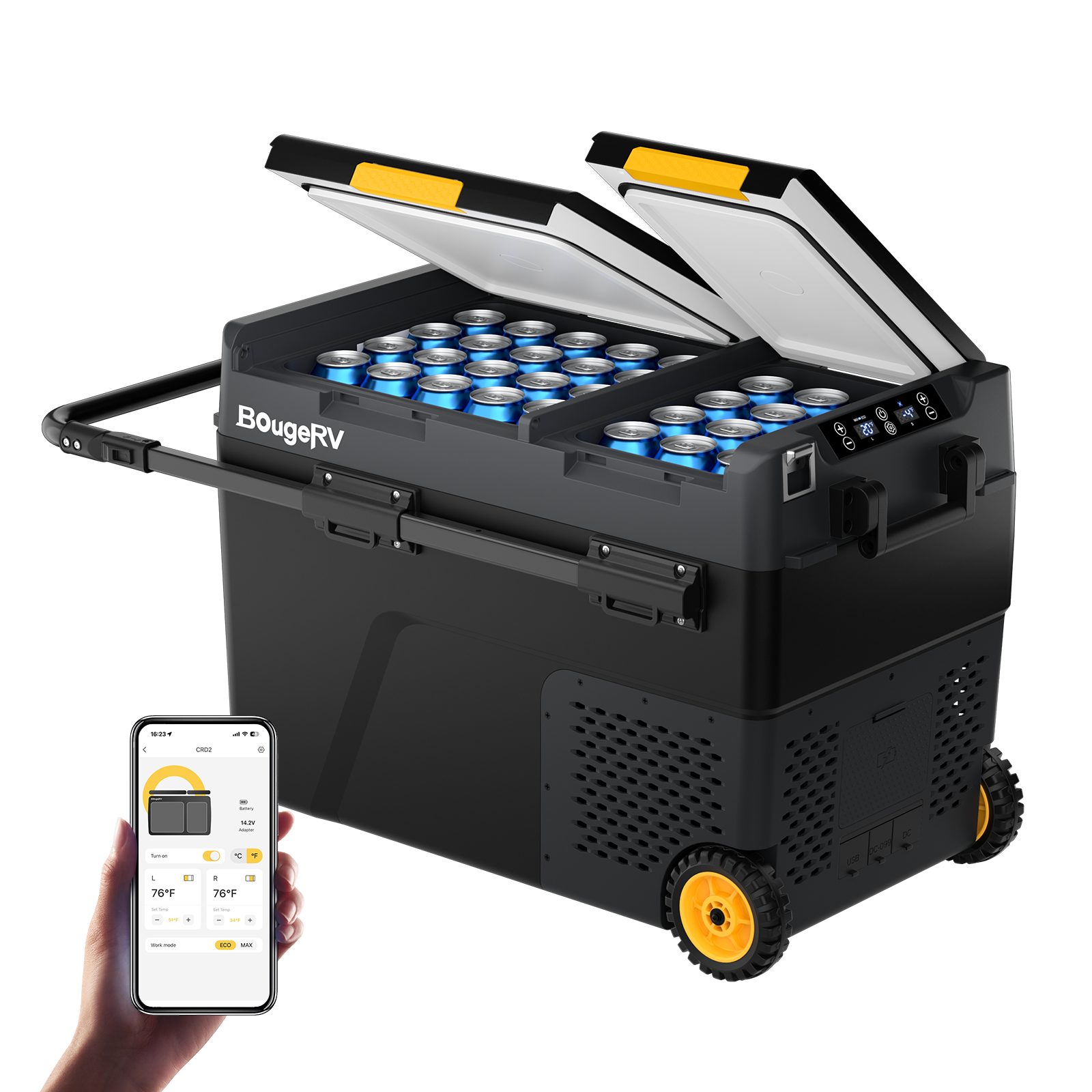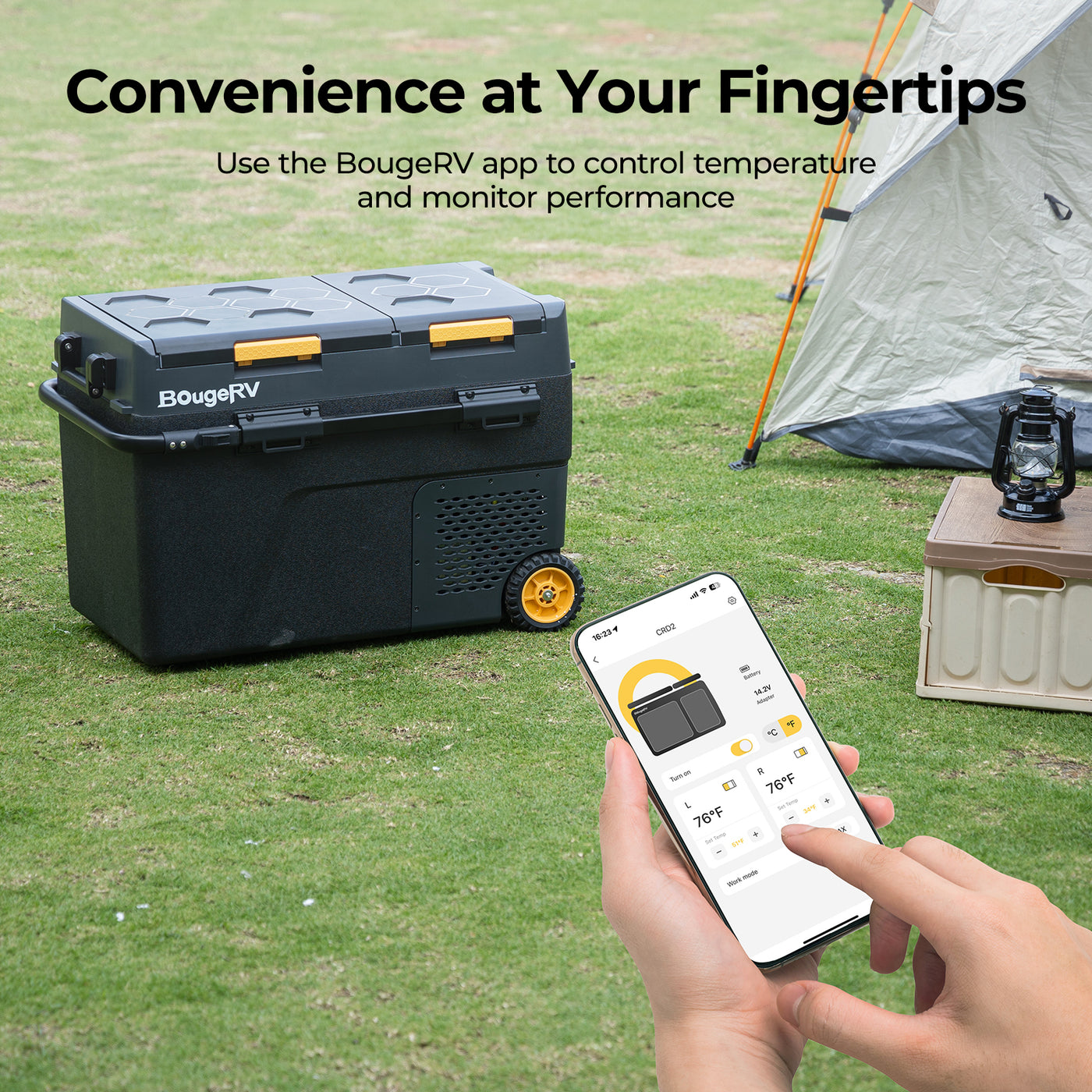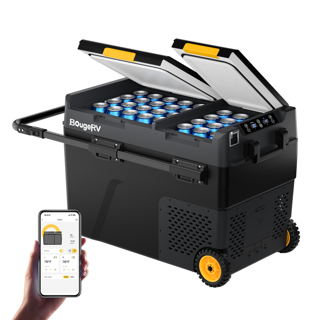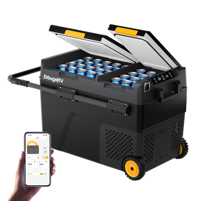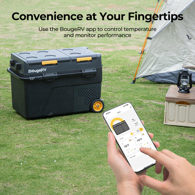 BougeRV portable fridges offer smartphone control via app for adjusting temperature and monitoring status remotely.