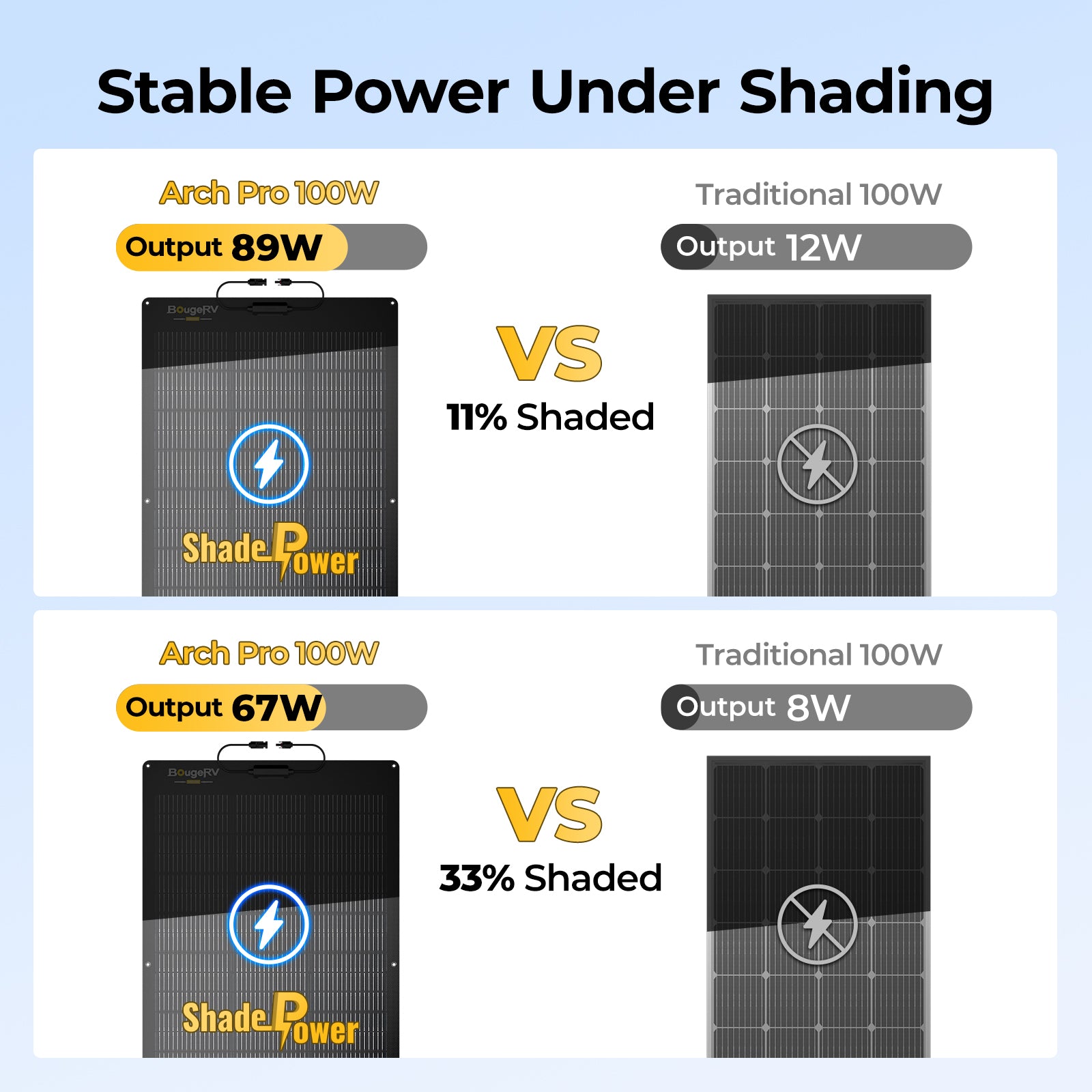 BougeRV 100W solar panel is versatile for powering a wide range of devices. It can charge 12V batteries, portable power stations, laptops, 12V fridges, camping lanterns, fans, and other small appliances.