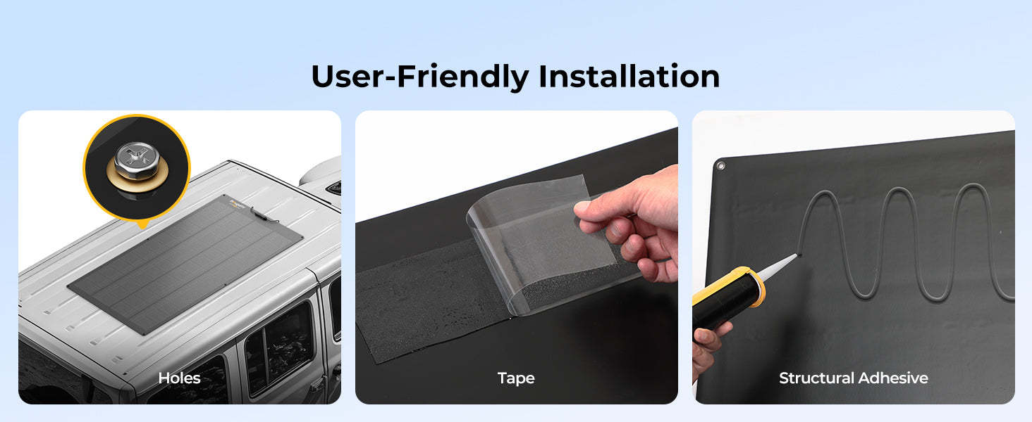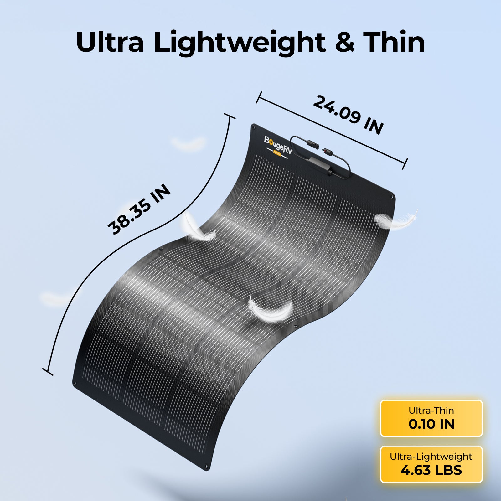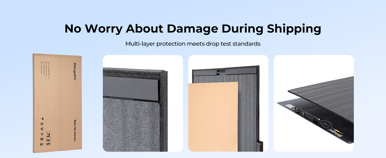 Designed for extreme conditions, the BougeRV curved fiberglass solar panel withstands strong winds (2400 Pa) and heavy snow (5400 Pa), reinforced by corrosion-resistant aluminum for a longer service life.