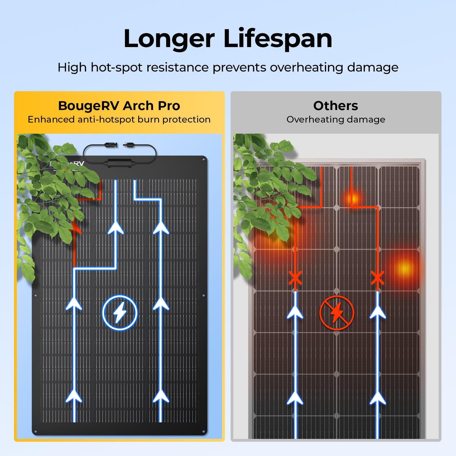Built with IP68 waterproof protection, BougeRV fiberglass N-type TOPCon curved solar panels are engineered to withstand full immersion in water and extreme weather conditions.