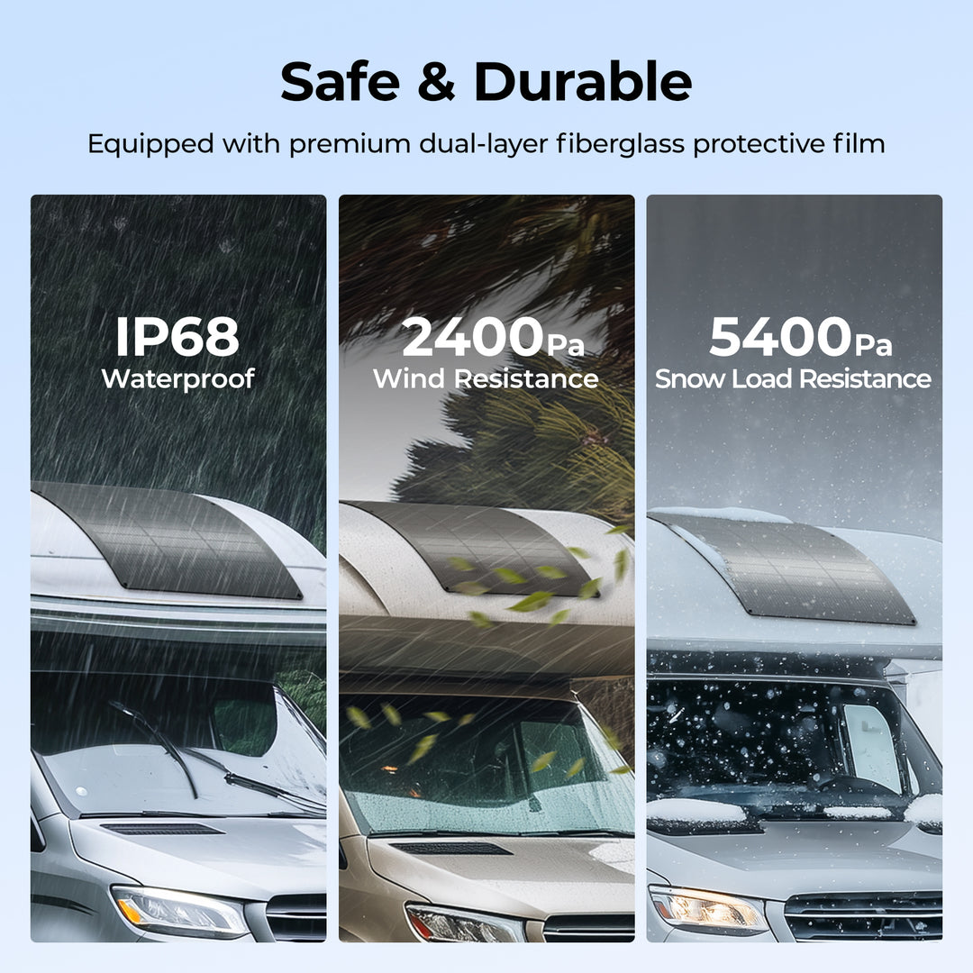 Designed for extreme conditions, the BougeRV curved fiberglass solar panel withstands strong winds (2400 Pa) and heavy snow (5400 Pa), reinforced by corrosion-resistant aluminum for a longer service life.