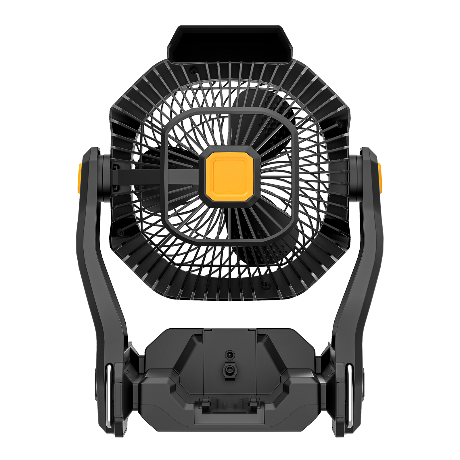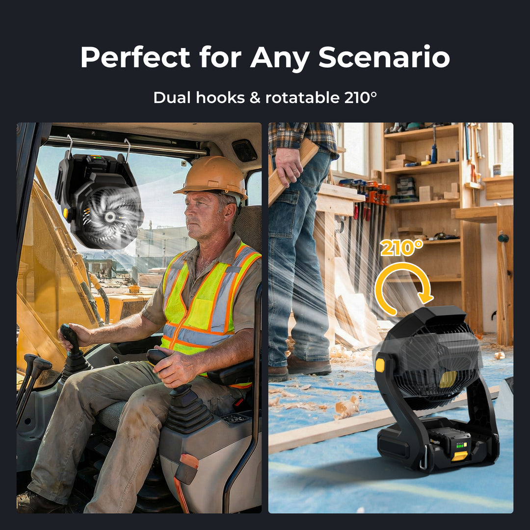 The F02 cordless jobsite fan offers versatile placement: it can stand on floors or workbenches, hang from beams or racks using its dual metal hooks, or rotate to direct airflow wherever you need it most.