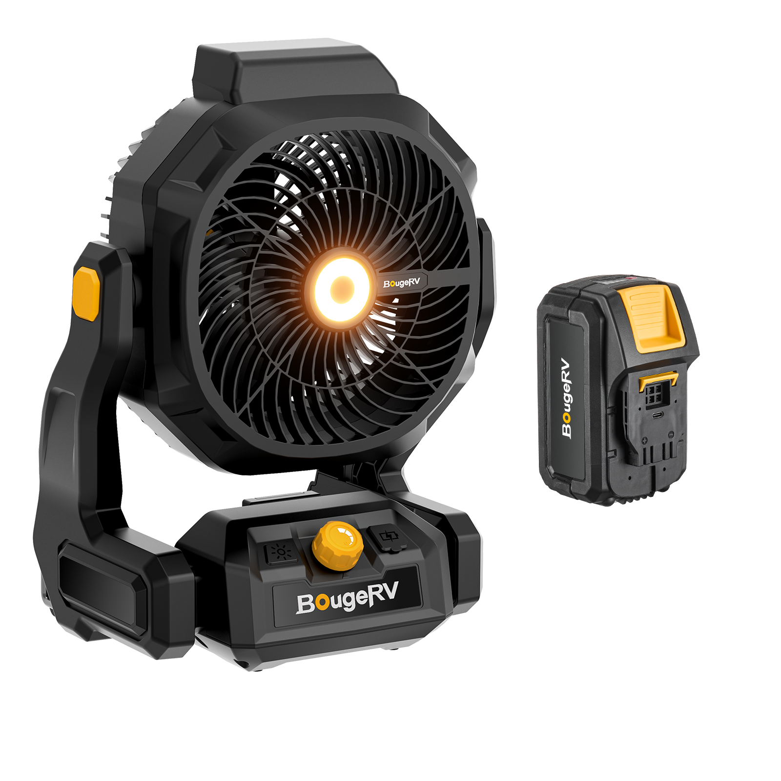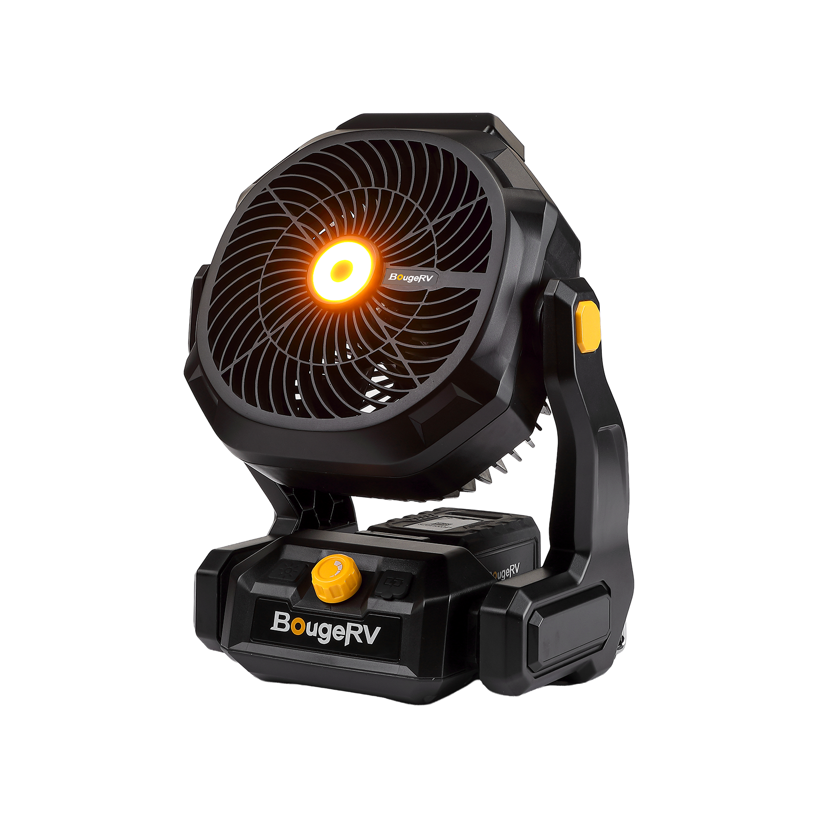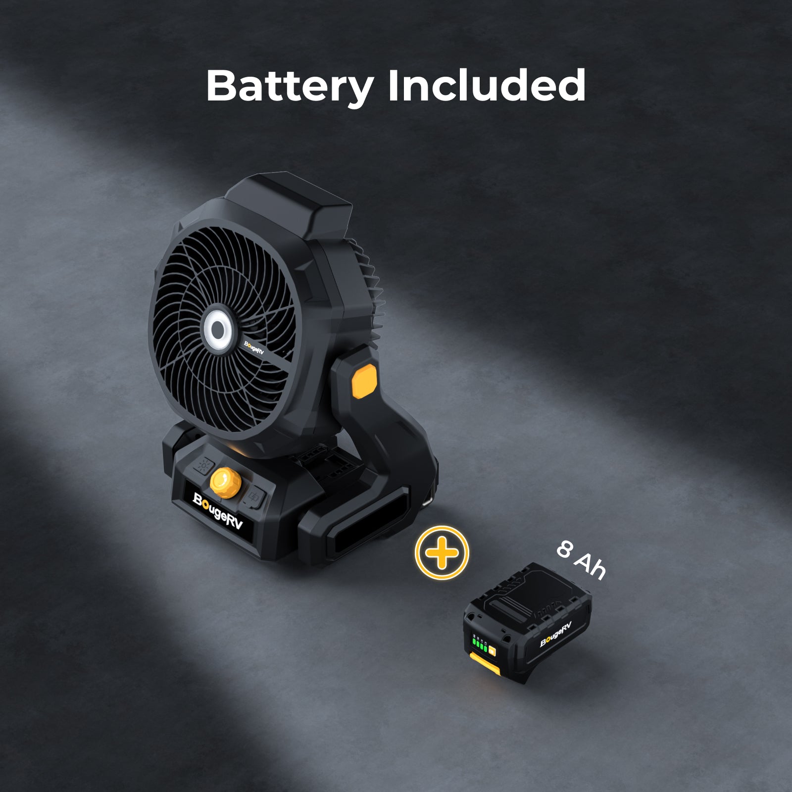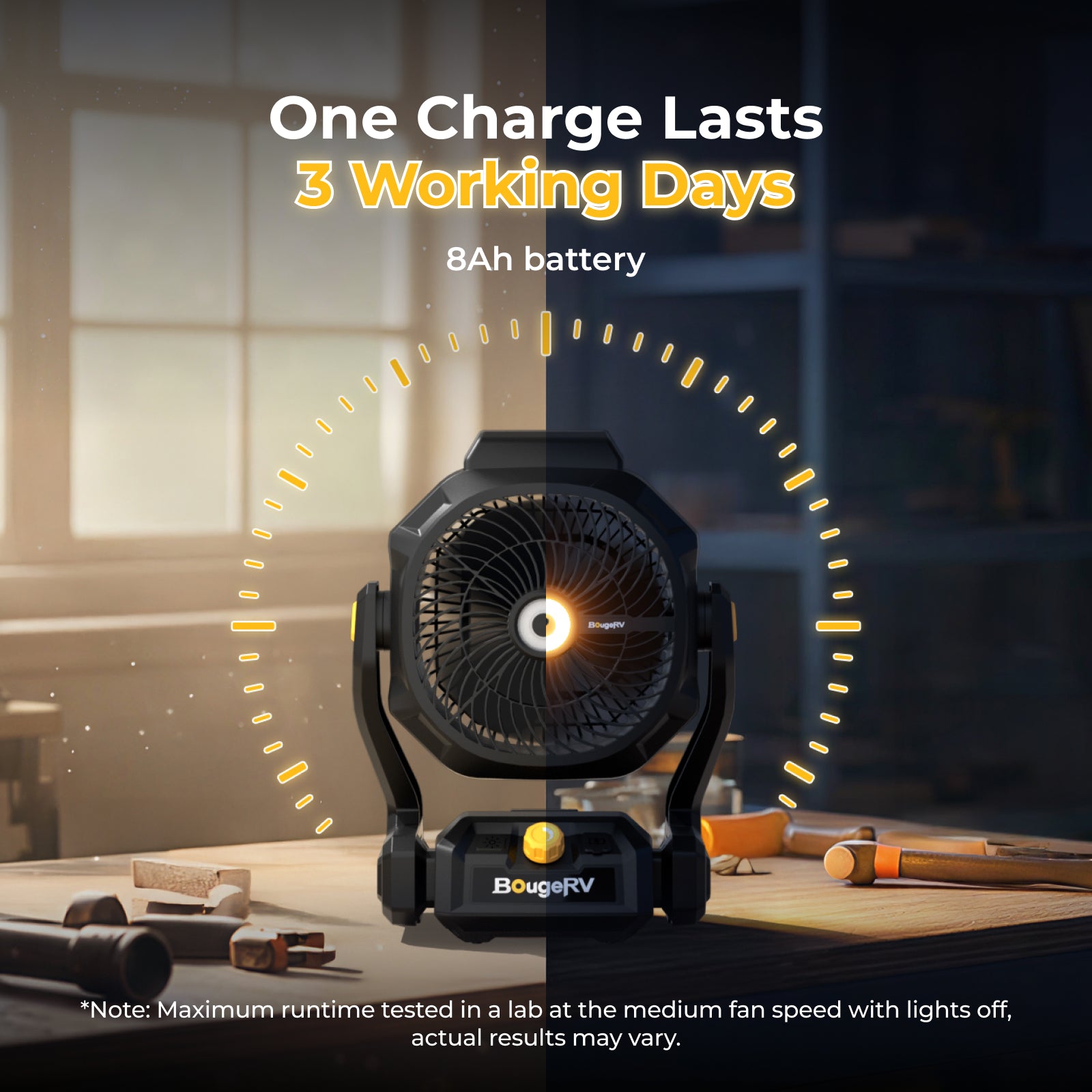 The BougeRV F02’s built‑in 8Ah (144 Wh) rechargeable battery delivers 8–72 hours of runtime on a full charge, depending on speed setting and usage patterns, making it ideal for long workdays or extended camping trips.