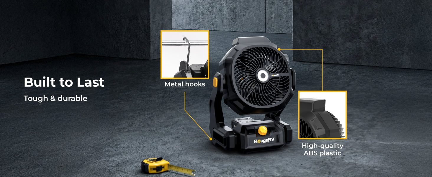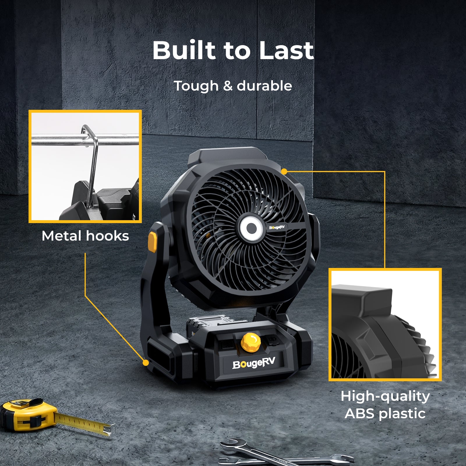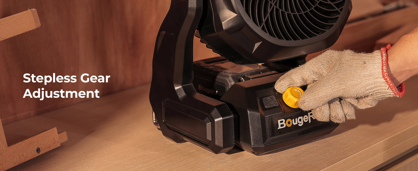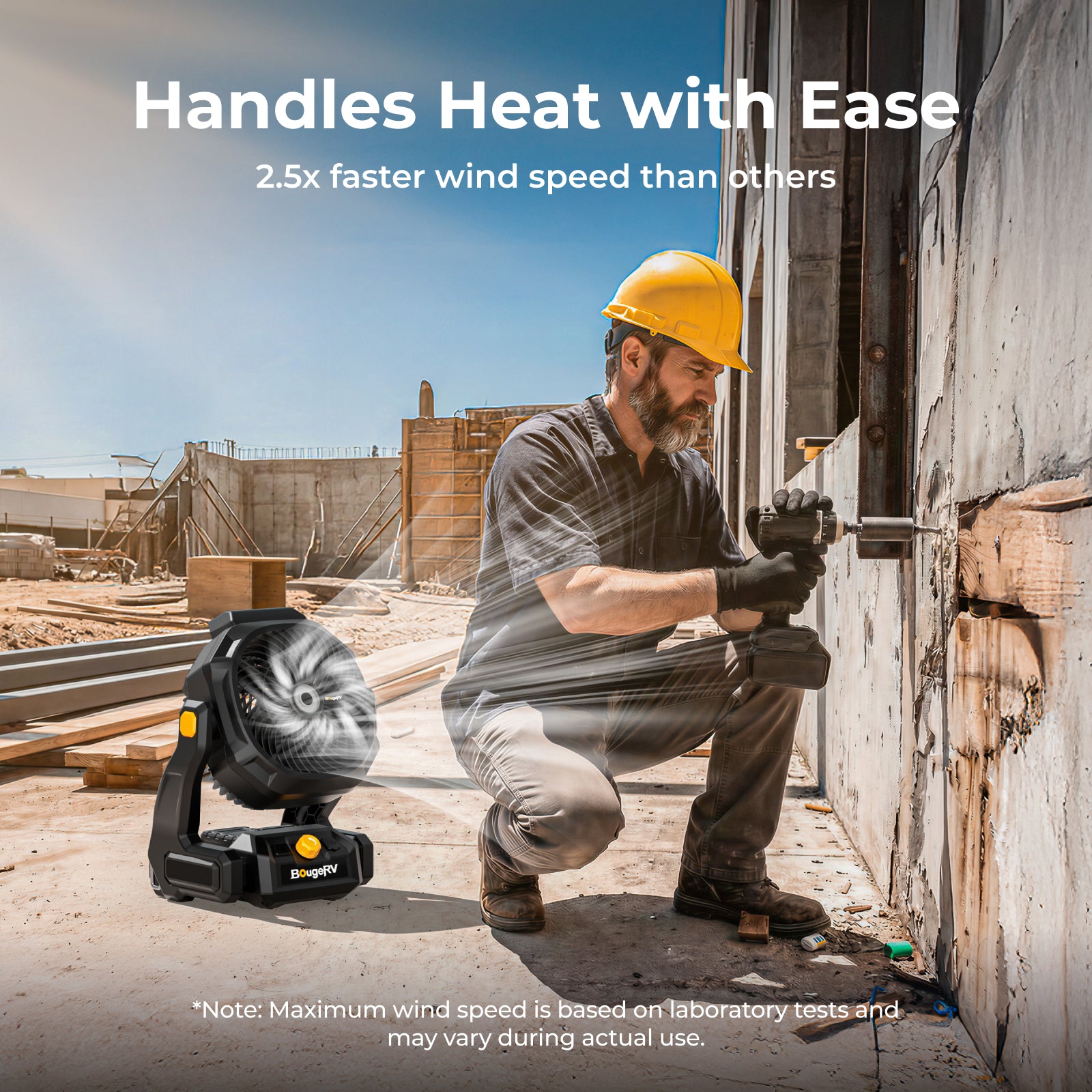 Heavy-duty cordless jobsite fans like the BougeRV F02 are designed to deliver strong airflow without excessive noise. At lower speeds, they operate relatively quietly with a smooth, consistent sound, while higher speeds naturally produce more airflow noise—but it’s typically not harsh or disruptive, making them suitable for jobsites, garages, and outdoor use.
