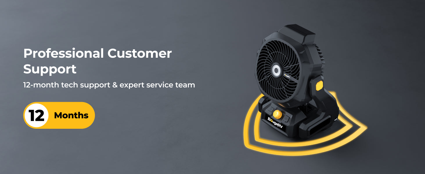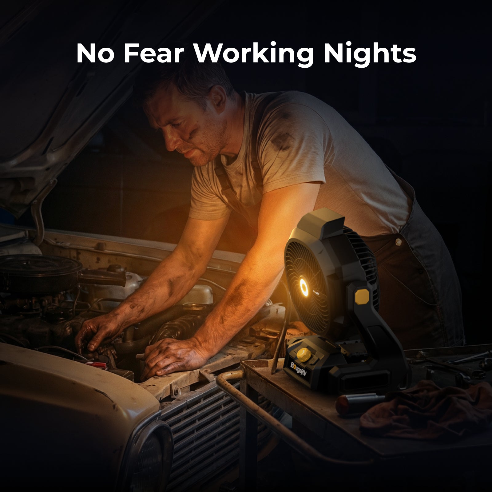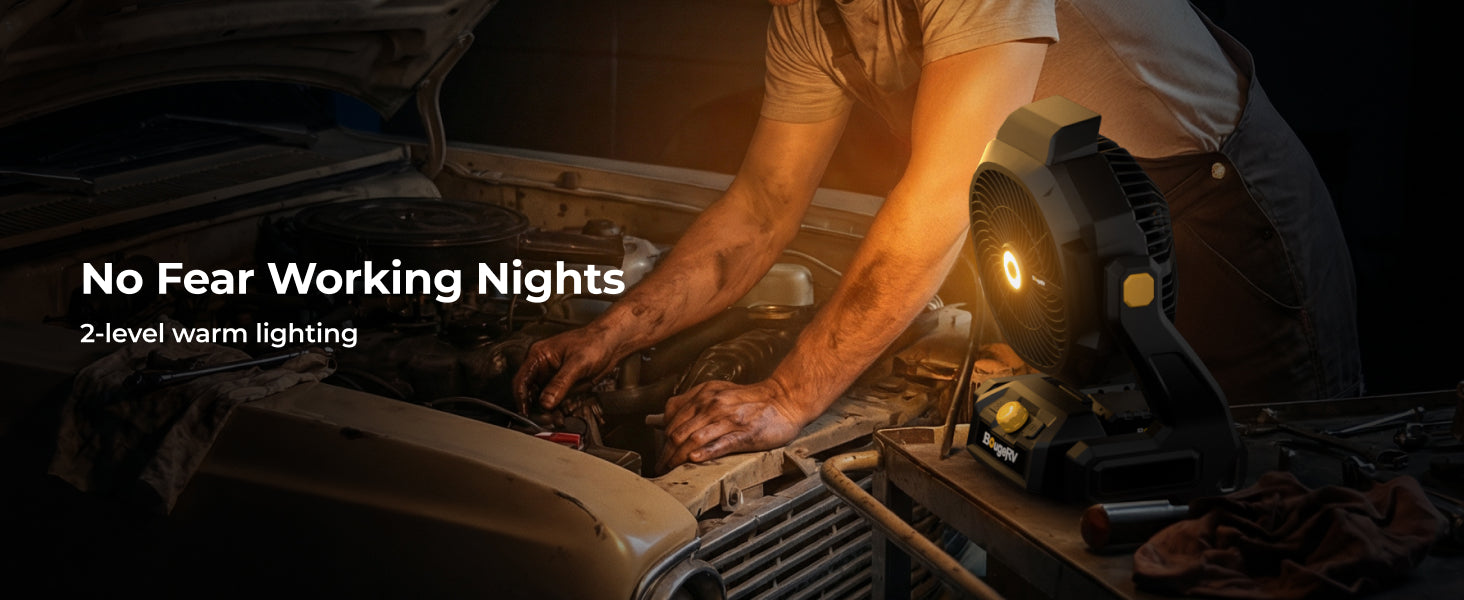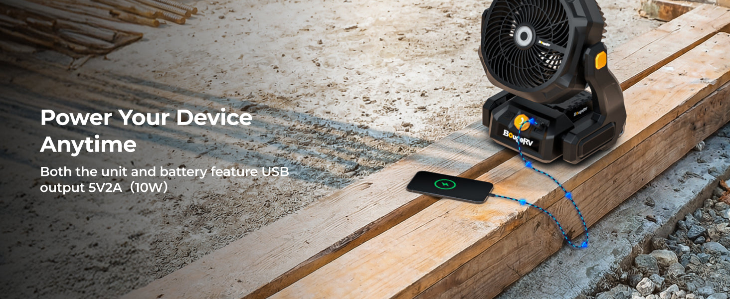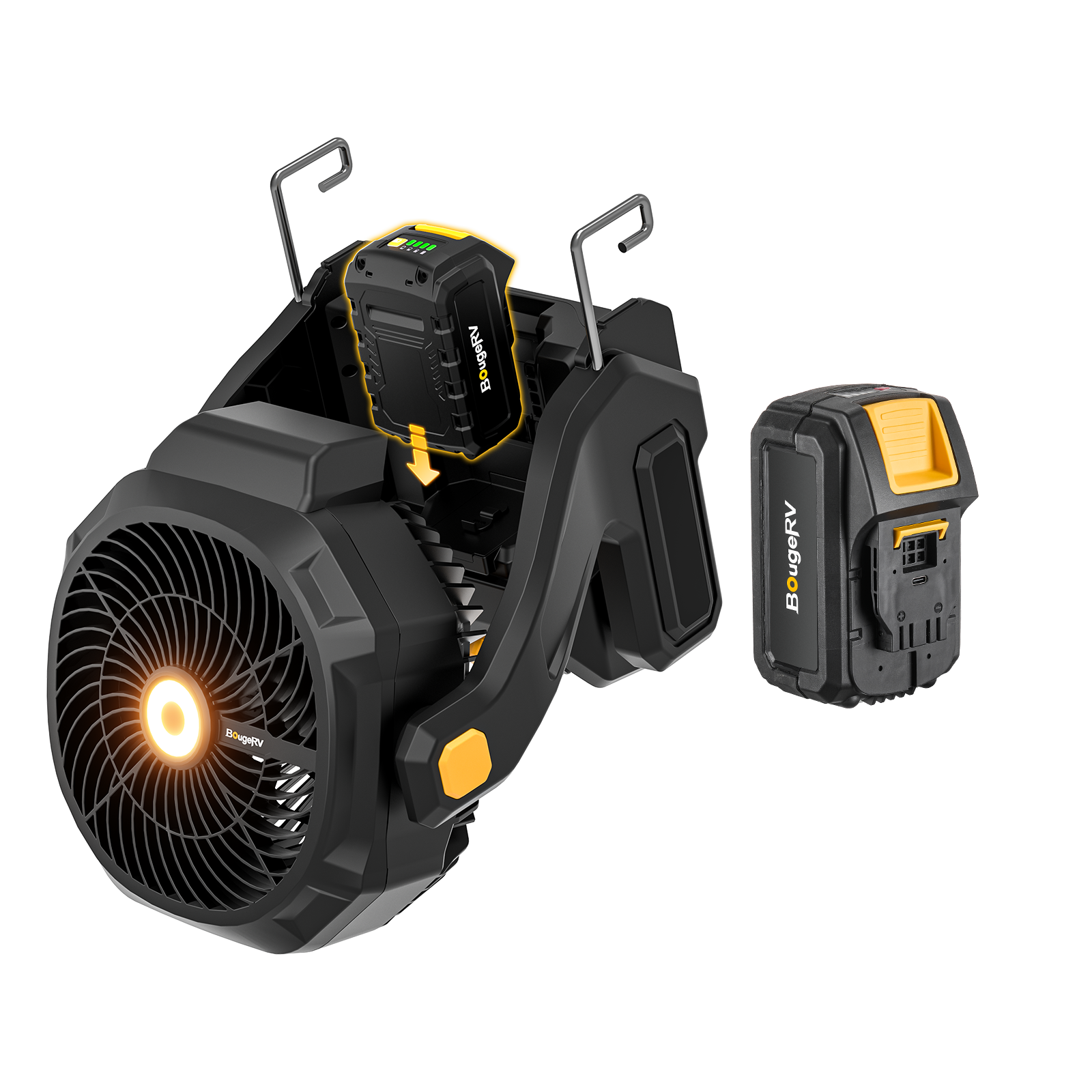 Heavy-duty cordless jobsite fans like the BougeRV F02 are designed to deliver strong airflow without excessive noise. At lower speeds, they operate relatively quietly with a smooth, consistent sound, while higher speeds naturally produce more airflow noise—but it’s typically not harsh or disruptive, making them suitable for jobsites, garages, and outdoor use.