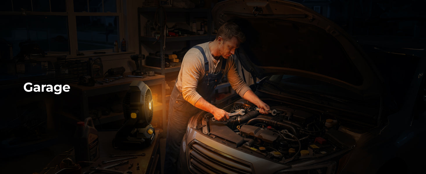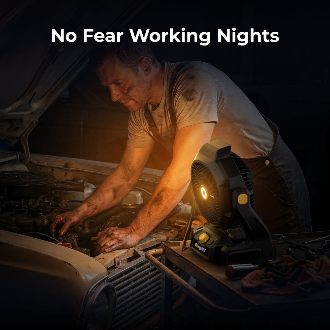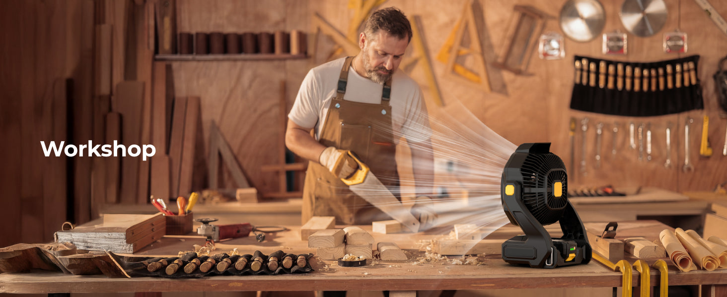 A portable jobsite fan is built for tough environments like workshops, garages, and outdoor jobsites. It offershigh airflow performance, long battery life, and rugged design.