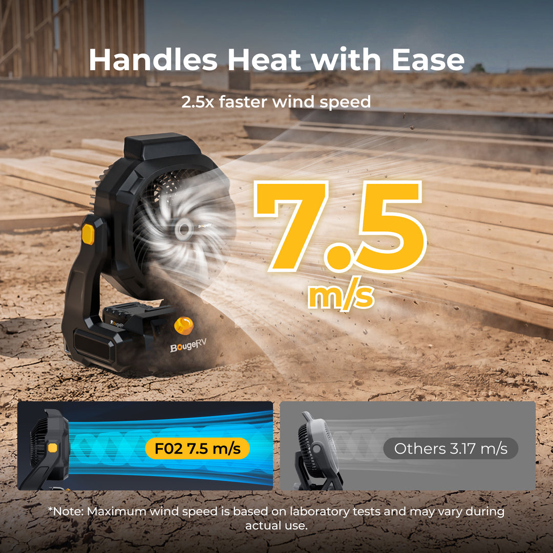 Don't let the heat slow you down. While standard outdoor fans struggle at 3.17m/s, the F02 delivers a massive 7.5m/s wind speed—that's 2.5x faster airflow for instant relief. Engineered for performance and tested in professional labs, it’s the ultimate high-velocity cooling solution for construction sites, workshops, and rugged outdoor environments.