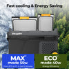 Eco mode reduces power consumption by lowering compressor intensity—ideal for nighttime or when using a small power station.