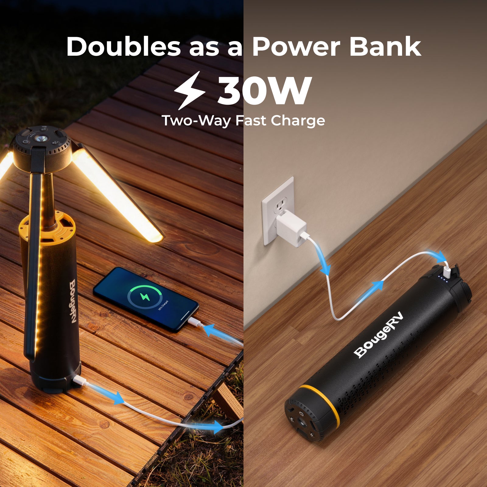 Most commonly, telescopic camping lights run on rechargeable batteries, often with USB charging capabilities. BougeRV camping light features rechargeable powerful 15600mAh battery, delivering up to 60 hours of use.
